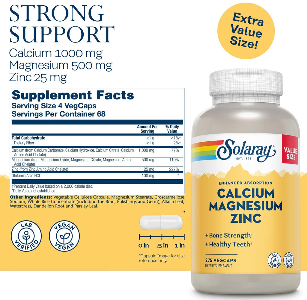 Solaray cálcio magnésio zinco, ossos e dentes fortes, coração, nervo e suporte de função imunológica, 275 cápsulas vegetais